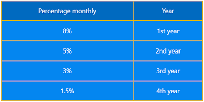 Ставка будет составлять 8% каждый месяц в течение первого года, 5% каждый месяц на 2-й год, 3% каждый месяц на 3-й год и 1,5% каждый месяц на 4-й год.
