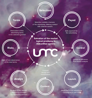 Технически платформа UMC будет реализована на различных платформах обмена сообщениями в виде BOT, а также в виде WEB-сайта. Финансирование проекта осуществляется за счет средств, привлеченных через ICO. Маркер UMCC - это рекламный фьючерсный контракт, маркер ERC20. Общее количество выпущенных токенов - 500 млн. 320 млн. Из них будут выставлены на публичную продажу по цене 0,1019 долларов.